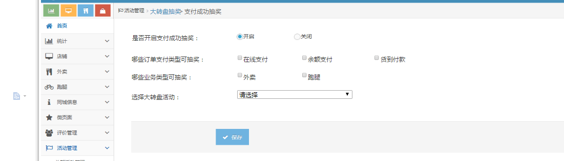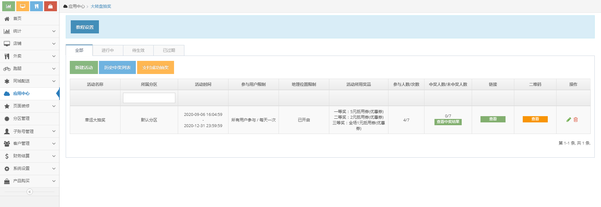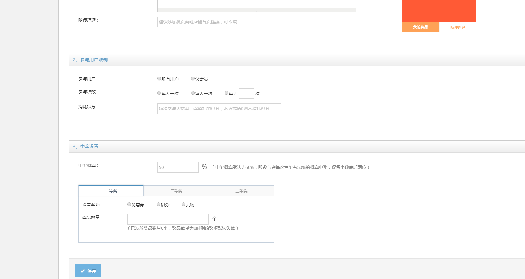 1.总部新建大转盘活动时必须要绑定一个分区,可绑定的只有直营分区,奖品由总部承担,此活动只能在该分区进行(入口只能在微页面添加,微页面的活动只能该分区才可以选择此项活动)若有优惠券的时候只能在该分区使用。