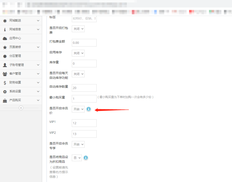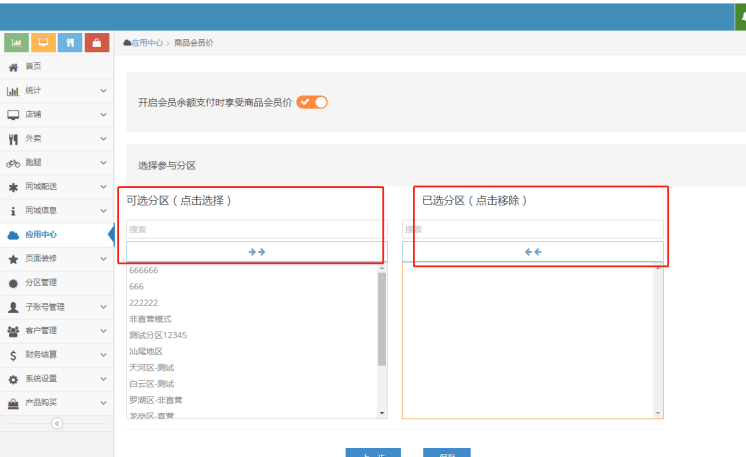 4.找到刚刚设置的店铺所属分区-开启会员余额支付时享受商品会员价