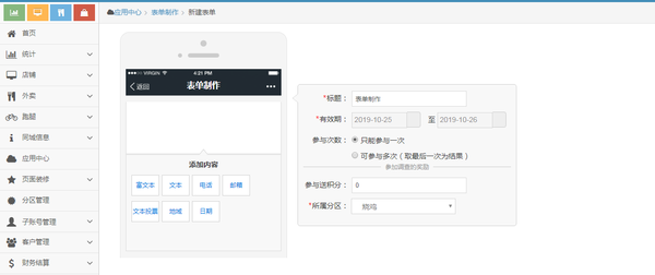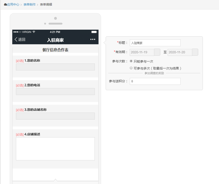 ②新建表单活动,填好活动规则,需要填写的是标题、活动有效期、参与限制、参与奖励和完成后的跳转链接.