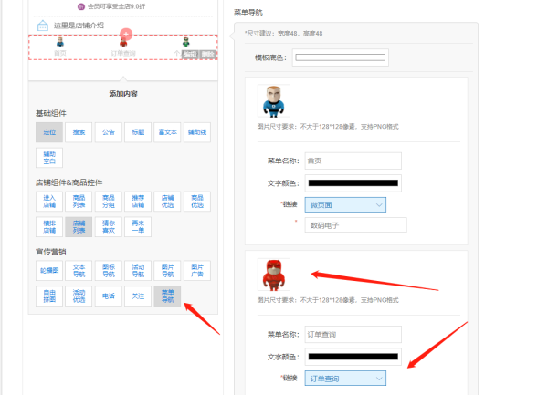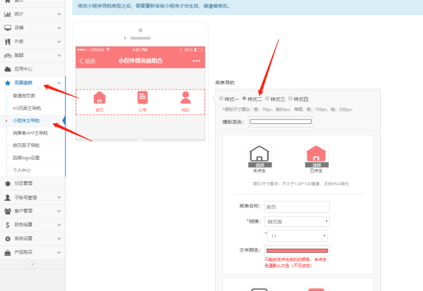 小程序主导航:小程序的微页面主导航在页面装修中设置 导航有多重样式可以自行选择