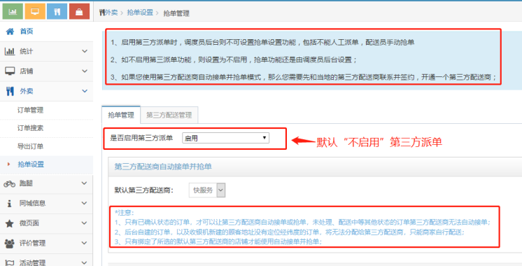 并且在下方给出对应的提示语“当模式为第三方配送商抢单,调度员后台不能设置”