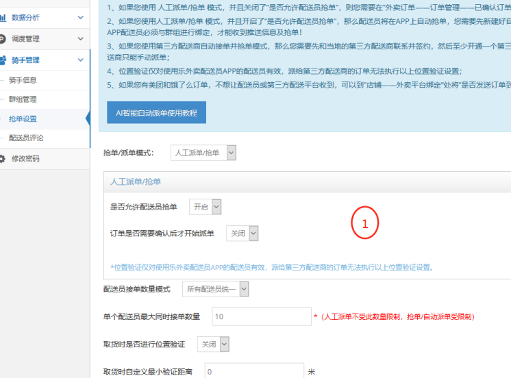 图二:分区后台设置的是第三方配送商接单抢单功能时,在调度员后台抢单模式改成如图2所示