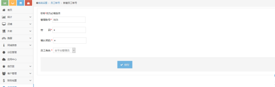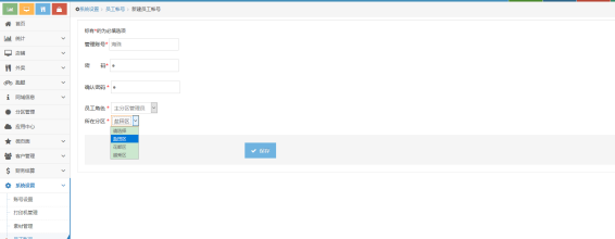 (1) 新建员工账号只能新建全平台管理员跟分区主管理,如果选择分区主管理则要选择对应的一个分区,