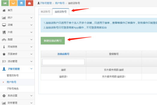 2)新建连锁店账号:一家店铺只能绑定一个连锁店账号,连锁店账号只能在商家app端登录。