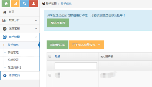 1)调度员可以管理外卖和跑腿订单,可以新建配送员账号以及群组管理