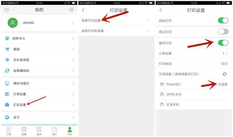 1、登录商家app,选择打印机设置——收银打印设置——开启蓝牙打印机,选择对应的蓝牙打印机设备连接后,