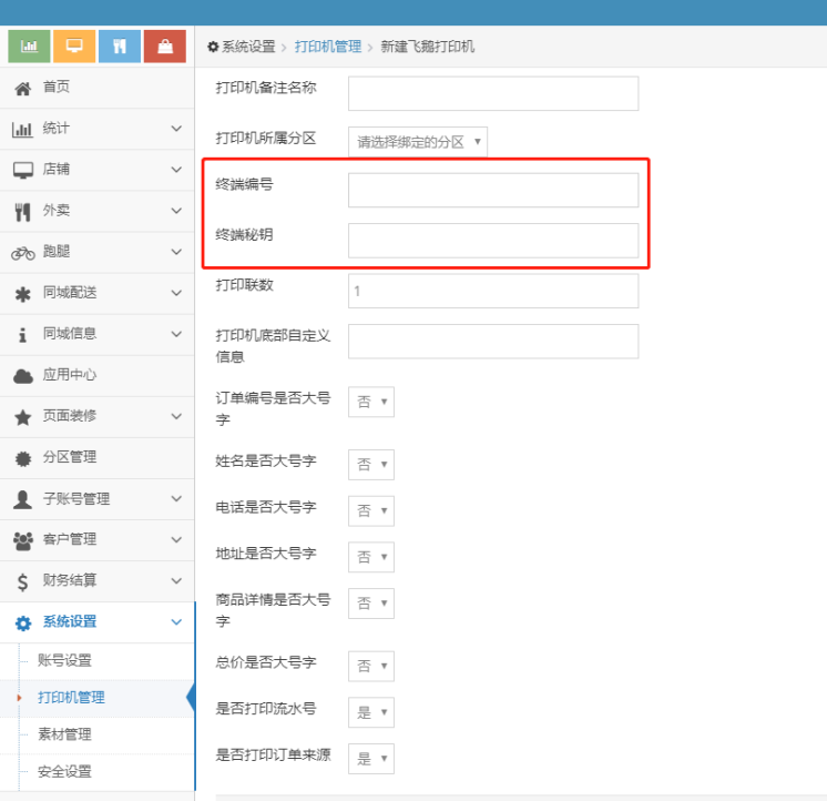 新建打印机填写的终端编号和终端秘钥请在打印机底部进行查找,打印机备注名称最好写上商家的店铺名称 下面那些字体大号的 可以自行设置