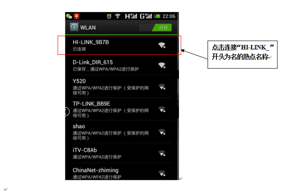 2、 利用安卓智能手机系统或苹果只能手机系统可以进行WIFI热点连接,打开只能手机,点击“设置”,接着进行WIFI搜索,此时将会搜索到“HI-LINK_”开头为名的热点名称,例如下图所示,然后点击连接,初始默认密码为:12345678
