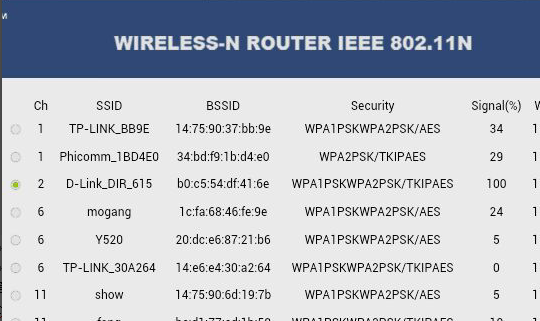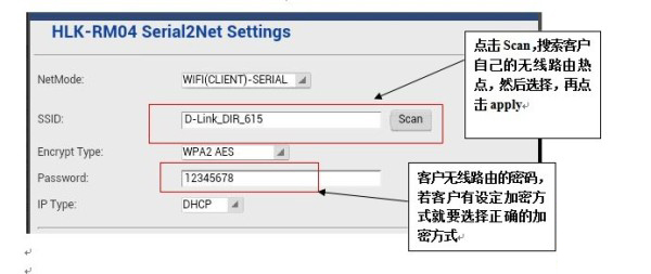 SSID :客户无线路由WIFI热点接入点名称(可以通过scan搜索,选择对应的热点,然后点击Apply)