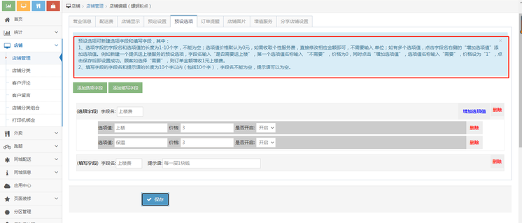 添加选项字段,是指添加选项让顾客下单的时候选择,如添加口味选项,配送时间段选项,预订时间段选项等。并针对选项值可以设置价格。