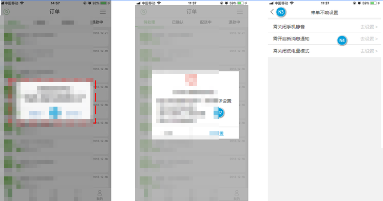 N1:去掉N1标注功能 N2:如果有检测到该App有以下几项都未设置,则弹窗提醒: 1.需开启新消息通知 2.需关闭静音,调整音量 3.需关闭低电量模式 您有N项设置影响接单,请按要求设置:项根据当前设备检测有未设置的系统项; (检测该设备是否有开启新消息通知,检测该设备声音是否开启,如果是静音模式则要提示,检测该设备是否有开启低电量模式;) 去设置:如果是只有一项的的时候,点击去设置则直接跳到系统设置对应的功能页面;如果是有两项以上(包含两项)则点击去设置跳到图三页面; 忽略:则关闭该弹窗 |