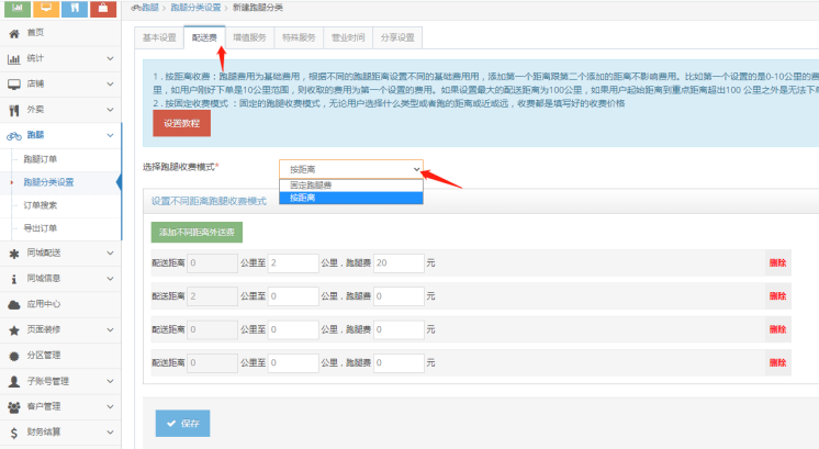 配送费收费模式:帮买,帮送,帮取有两种配送模式,按距离设置跑腿费和固定跑腿费;