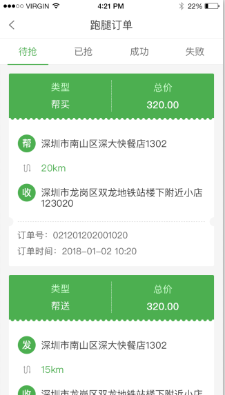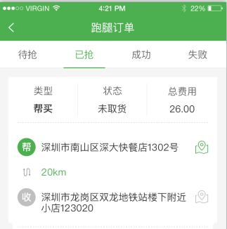 1. 待抢订单,已抢订单,成功订单,失败订单。商家详细看清跑腿订单的每一个类型。