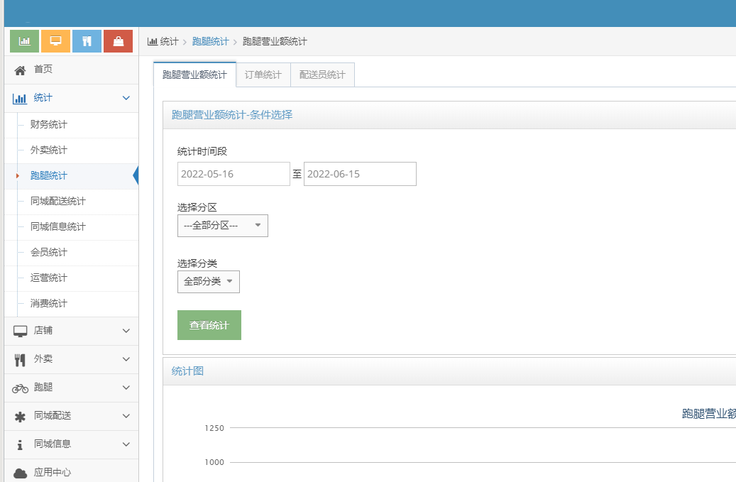 1. 跑腿营业额统计支持固定模版筛选统计,选择不同跑腿分类类型统计出指定时间段当天的营业额