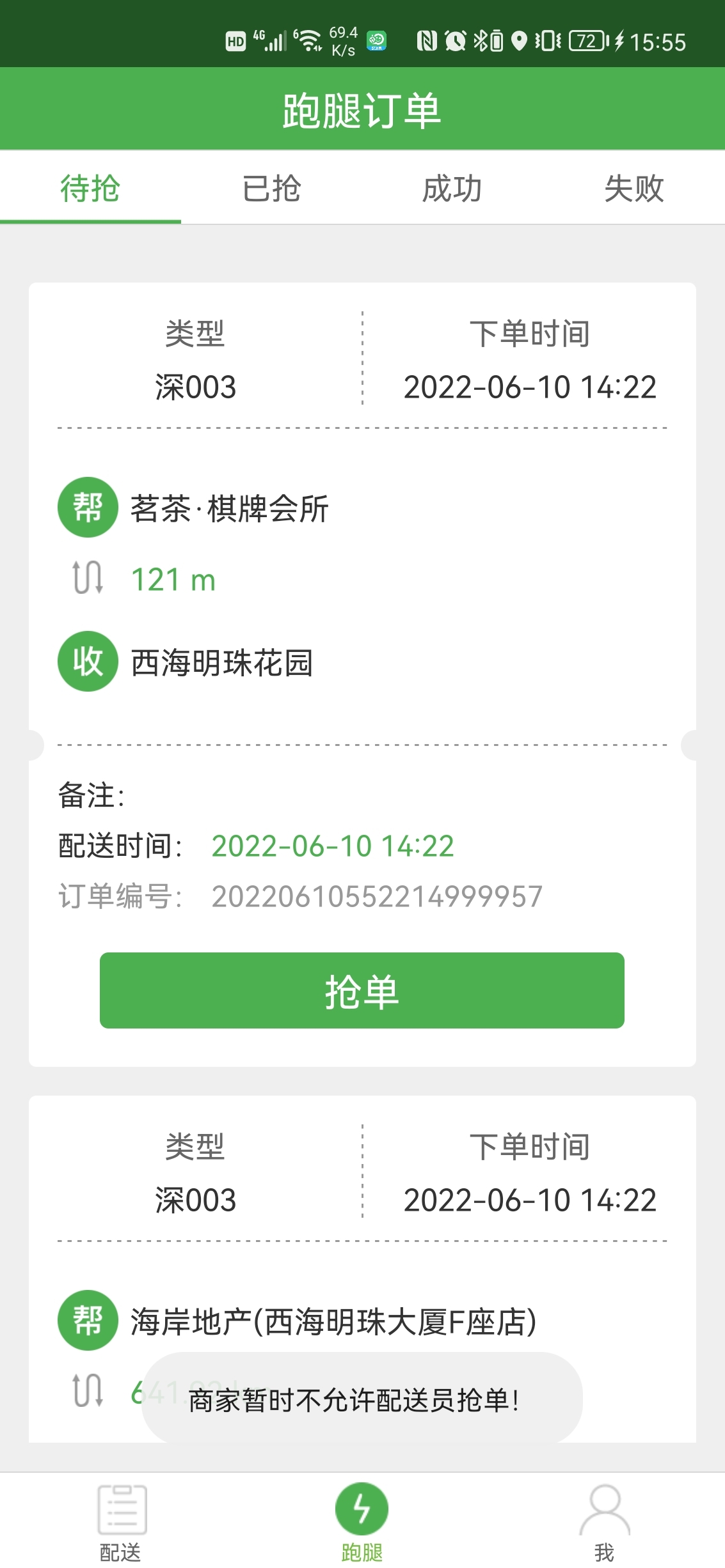 允许配送员抢单则配送员工抢单成功后会有“抢单成功”提示语。抢单成功订单则在已抢状态下。