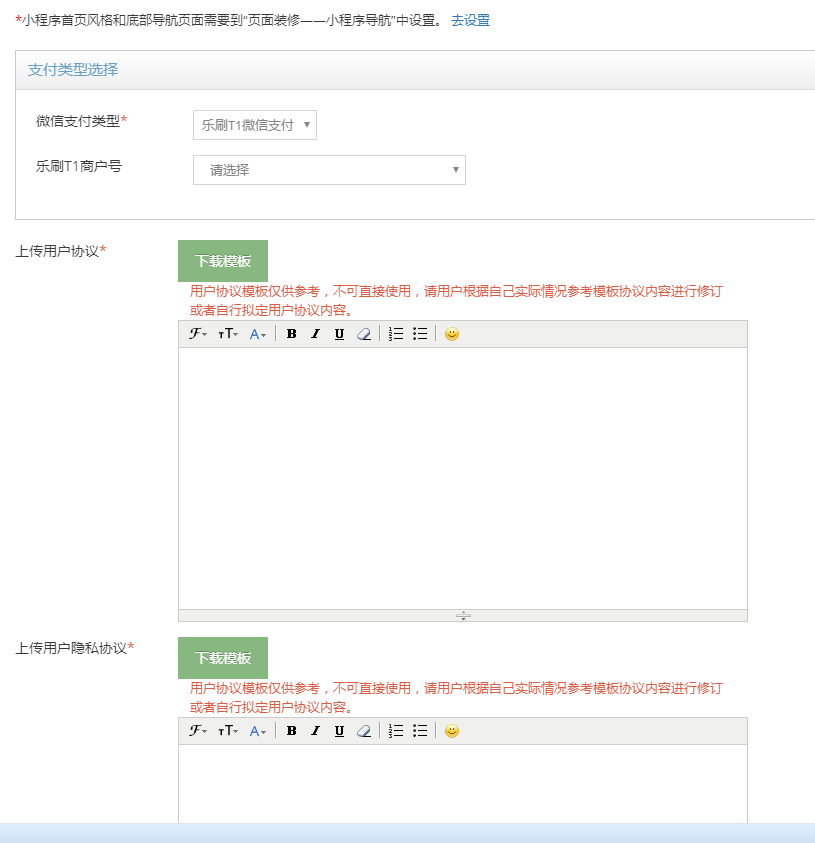 一、安菲云后台新建一个小程序,填写完善微信支付参数选择乐刷商户号 带*星号必填