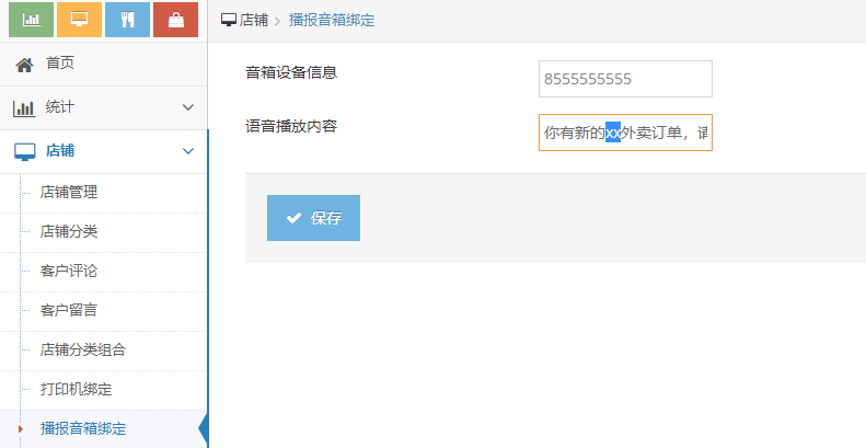1. 菜单栏点击店铺 进入播报音箱设置 然后给店铺进行绑定音响