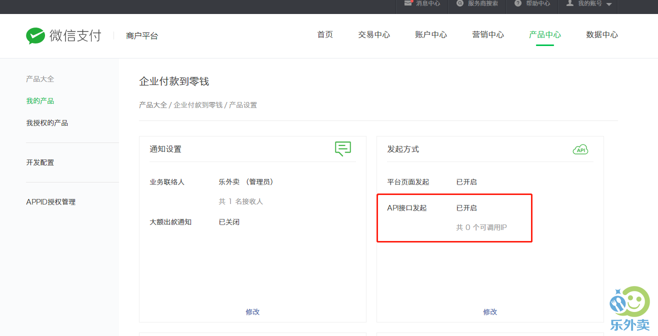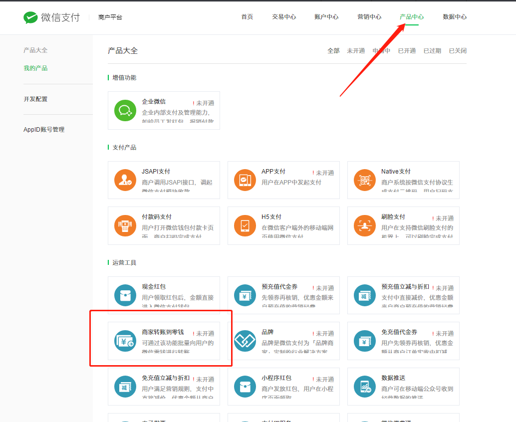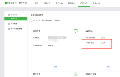 2.我们需要登录微信支付商户后台,选择产品中心-企业付款到零钱-产品设置: