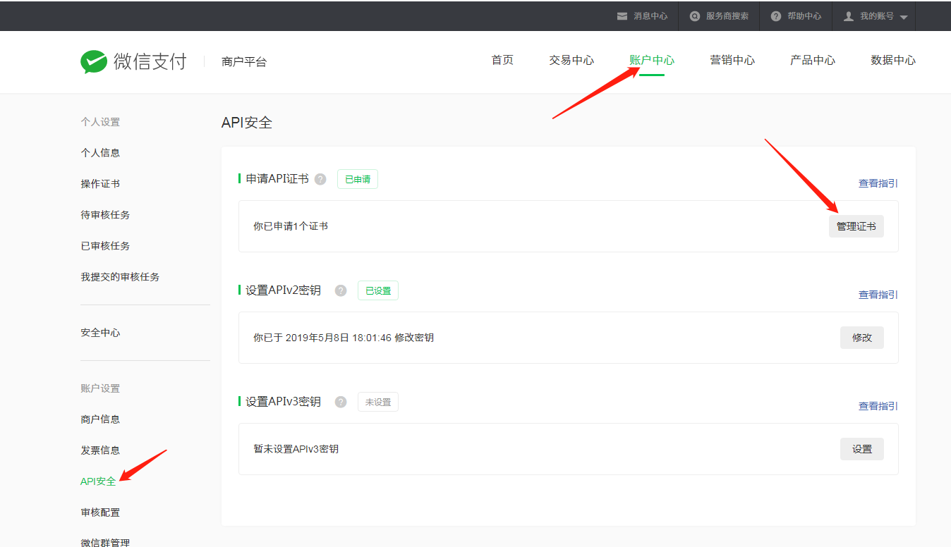 (1).进入账户中心的API安全,点击管理证书,点击申请证书: