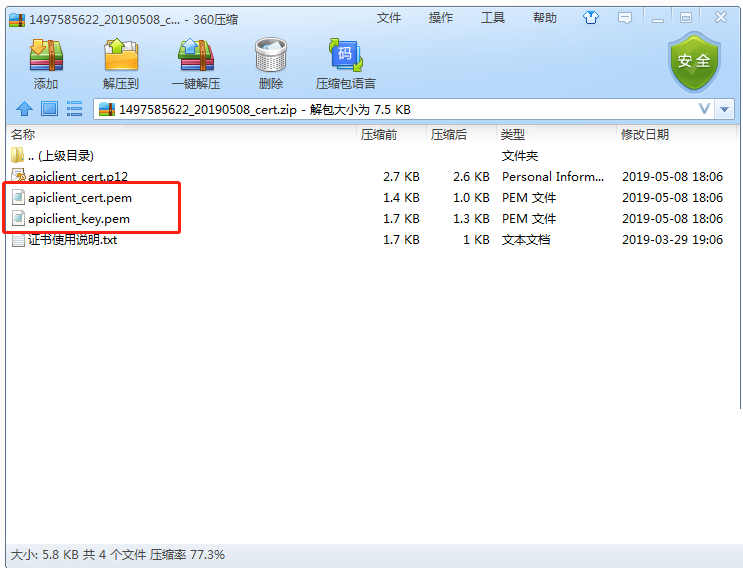 (8).打开该压缩文件后看到这两个文件,找到相应的参数位置填写后,证书参数就设置完成了