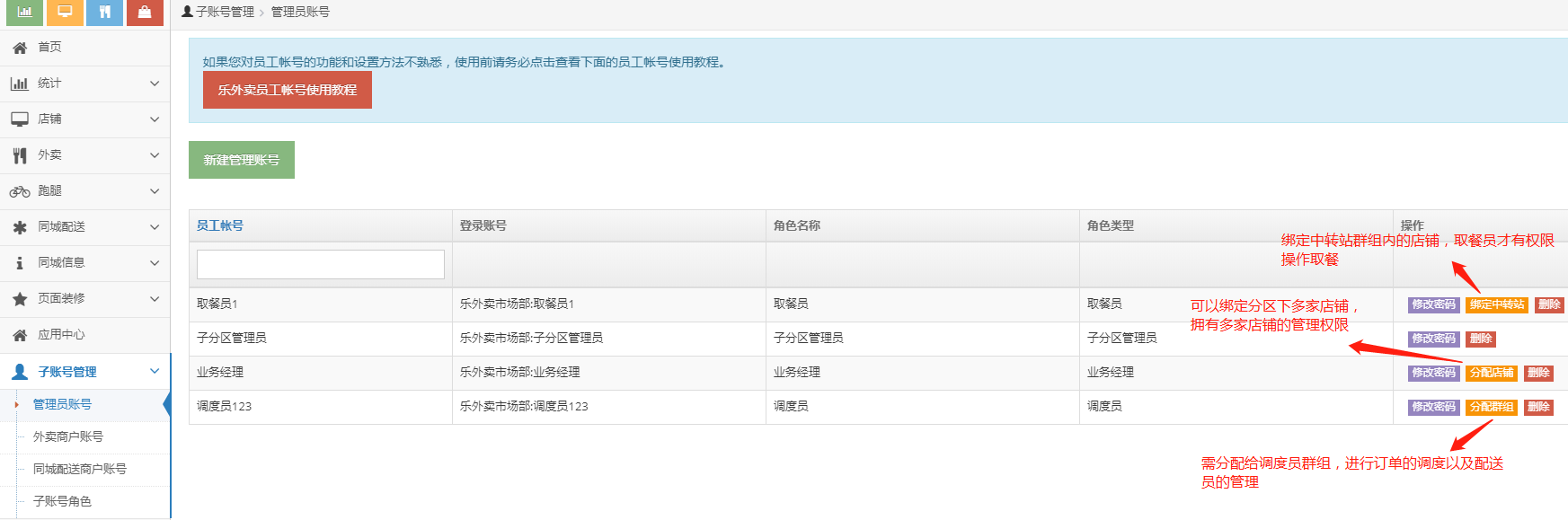 (子分区管理--业务经理--调度员-取餐员)