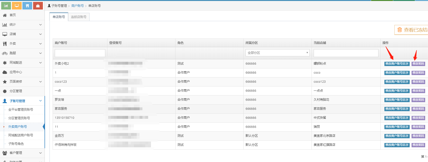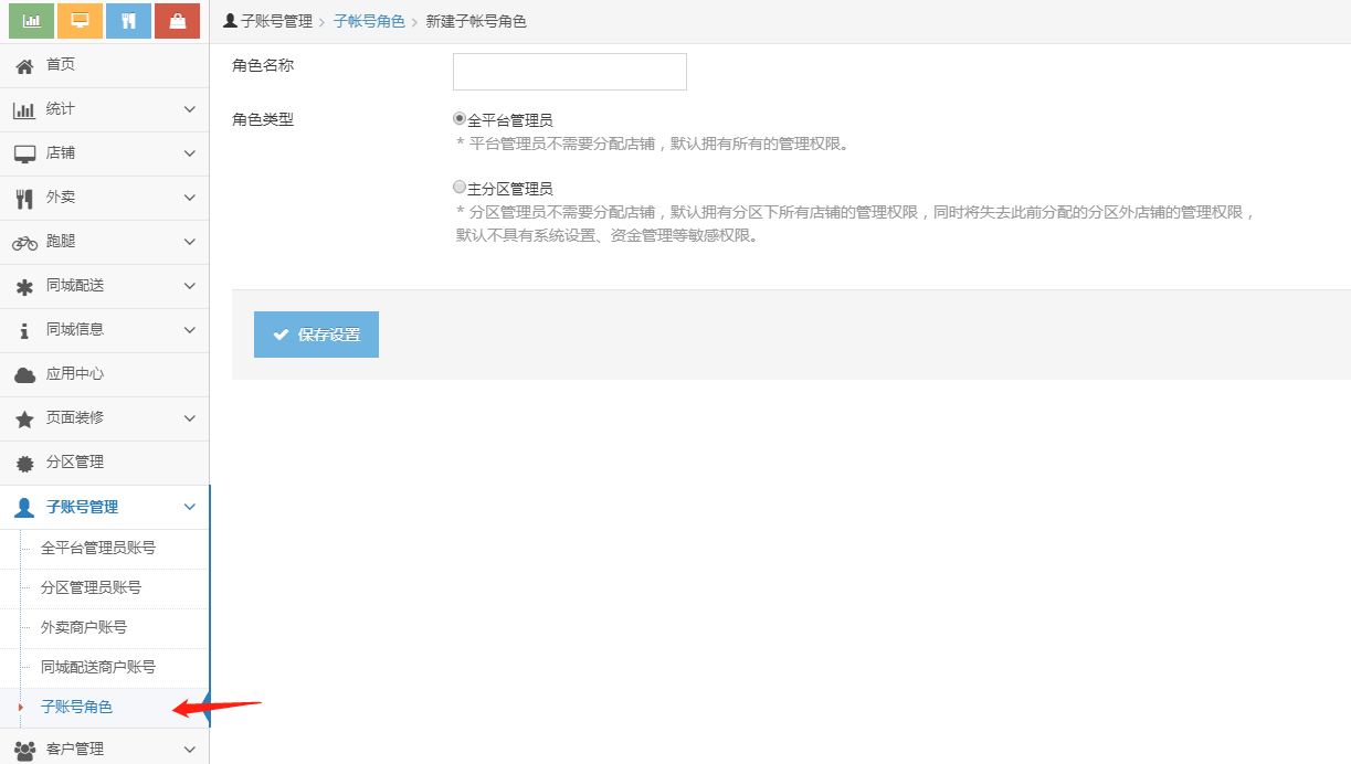主分区账号:分区管理员不需要分配店铺,默认拥有分区下所有店铺的管理权限,同时将失去此前分配的分区外店铺的管理权限,