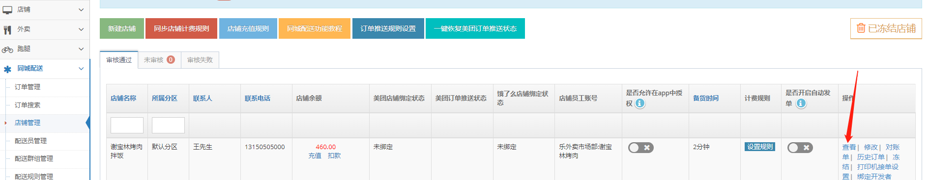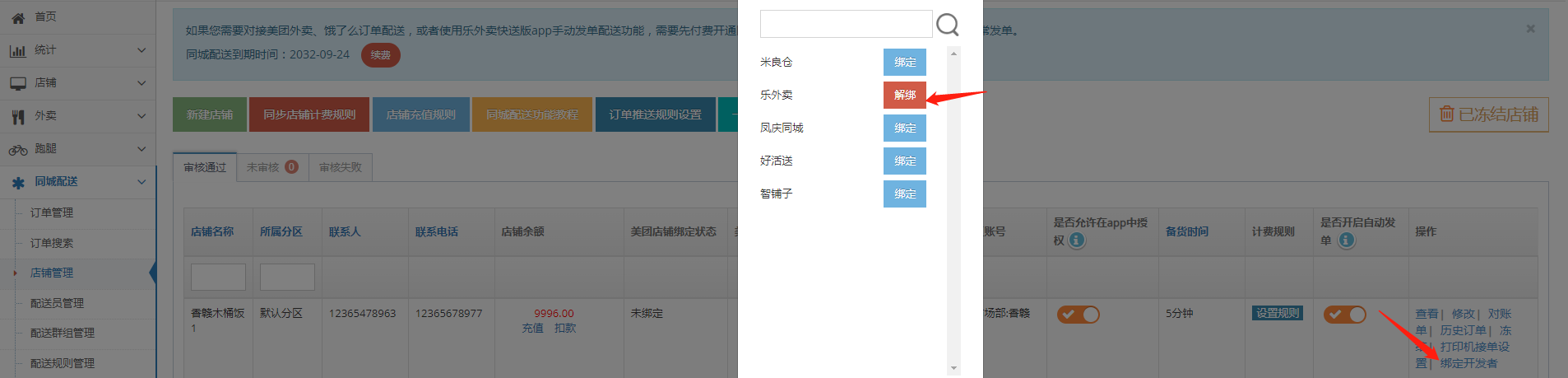 4、找到对应的自配送商家店铺,绑定设置;把复制的同城配送店铺ID绑定进去
