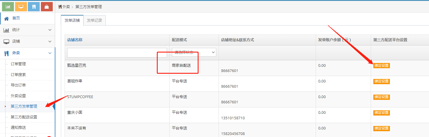 绑定好对应的店铺参数后,平台外卖自配送商家店铺就可以发单到同城配送给平台骑手配送了。